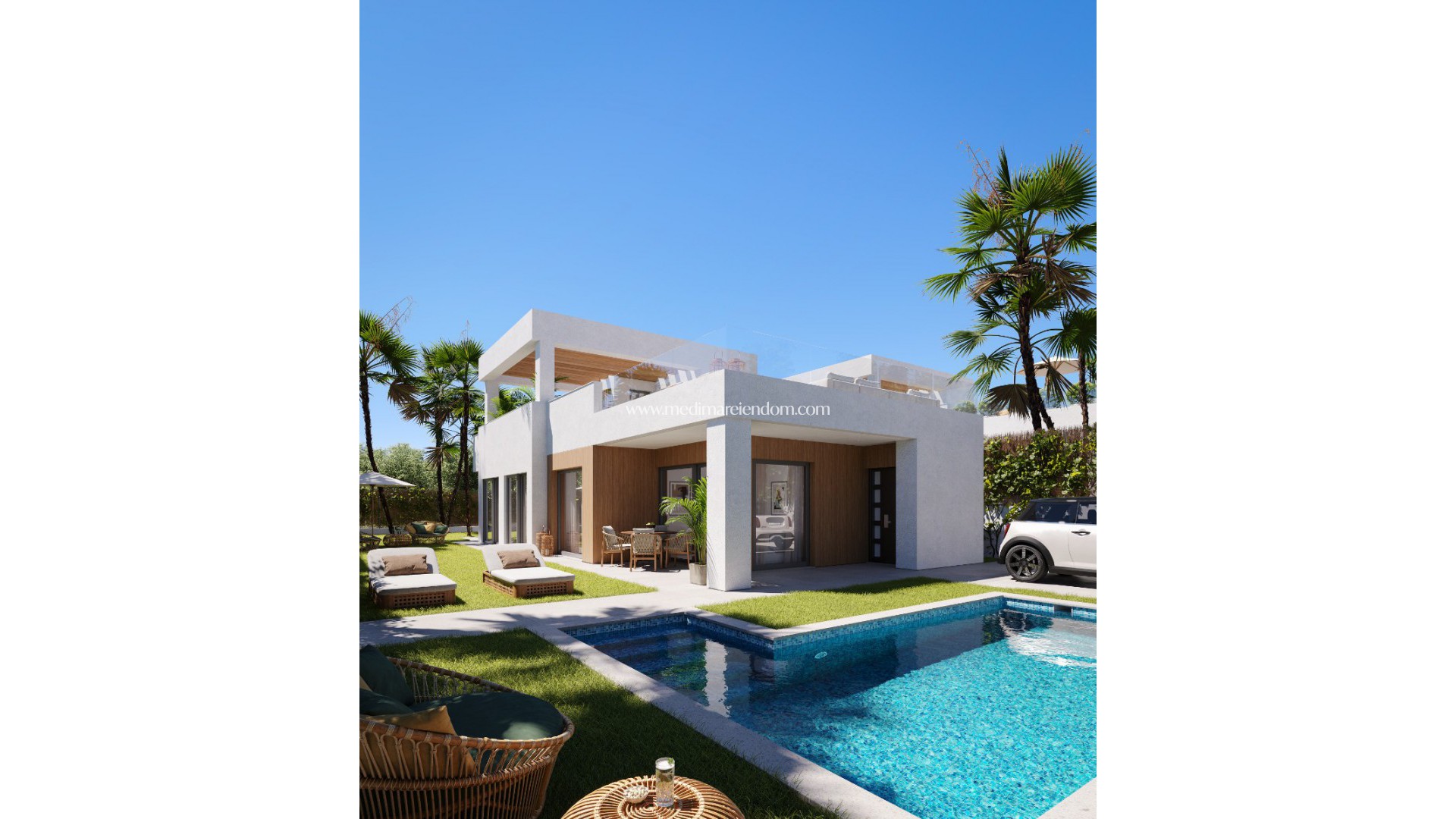 Husen är byggda på tomter på 393-517m2 med privat pool och har ett rymligt vardagsrum med öppet kök, 3 sovrum med inbyggda garderober och 2 badrum.