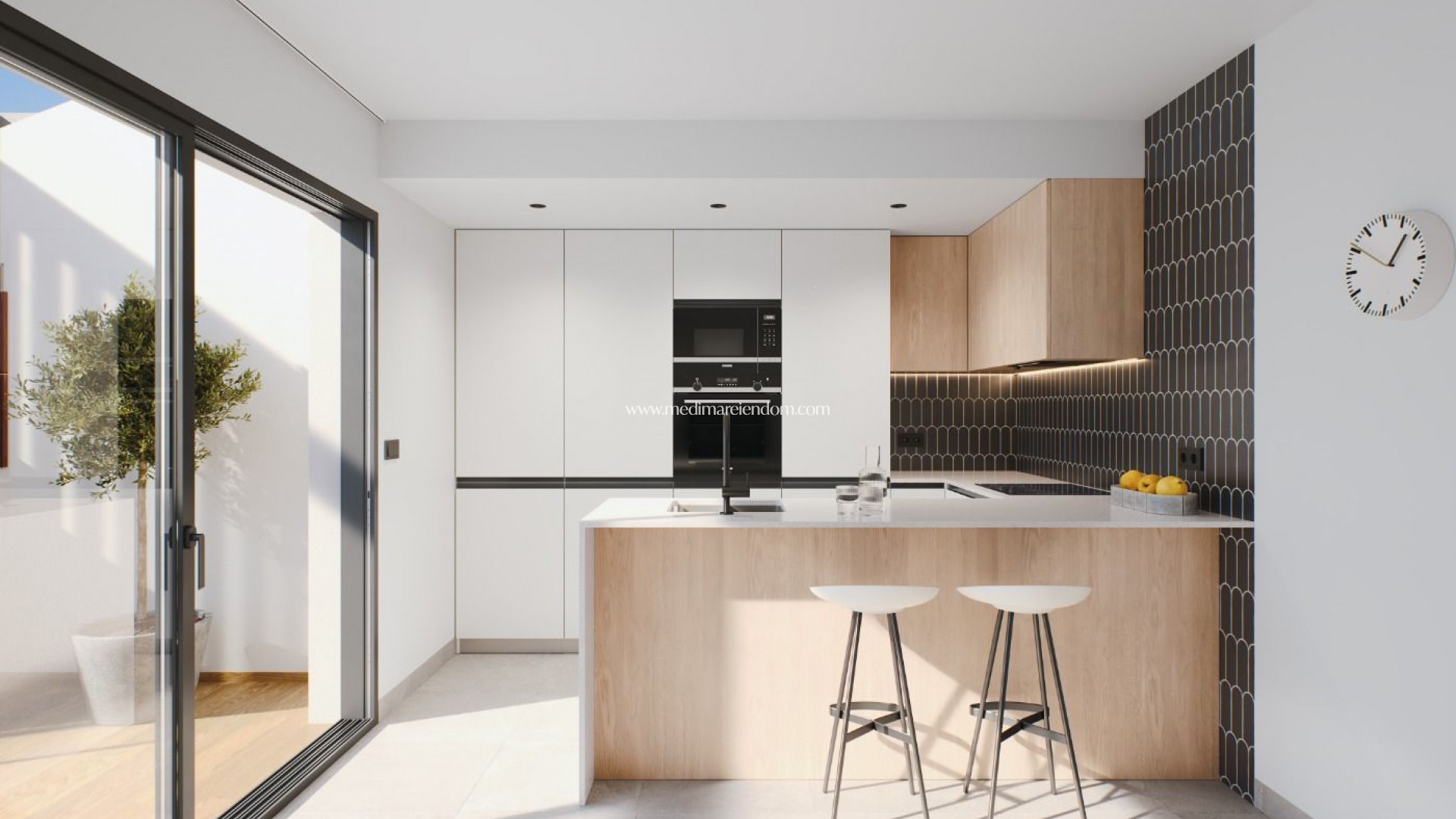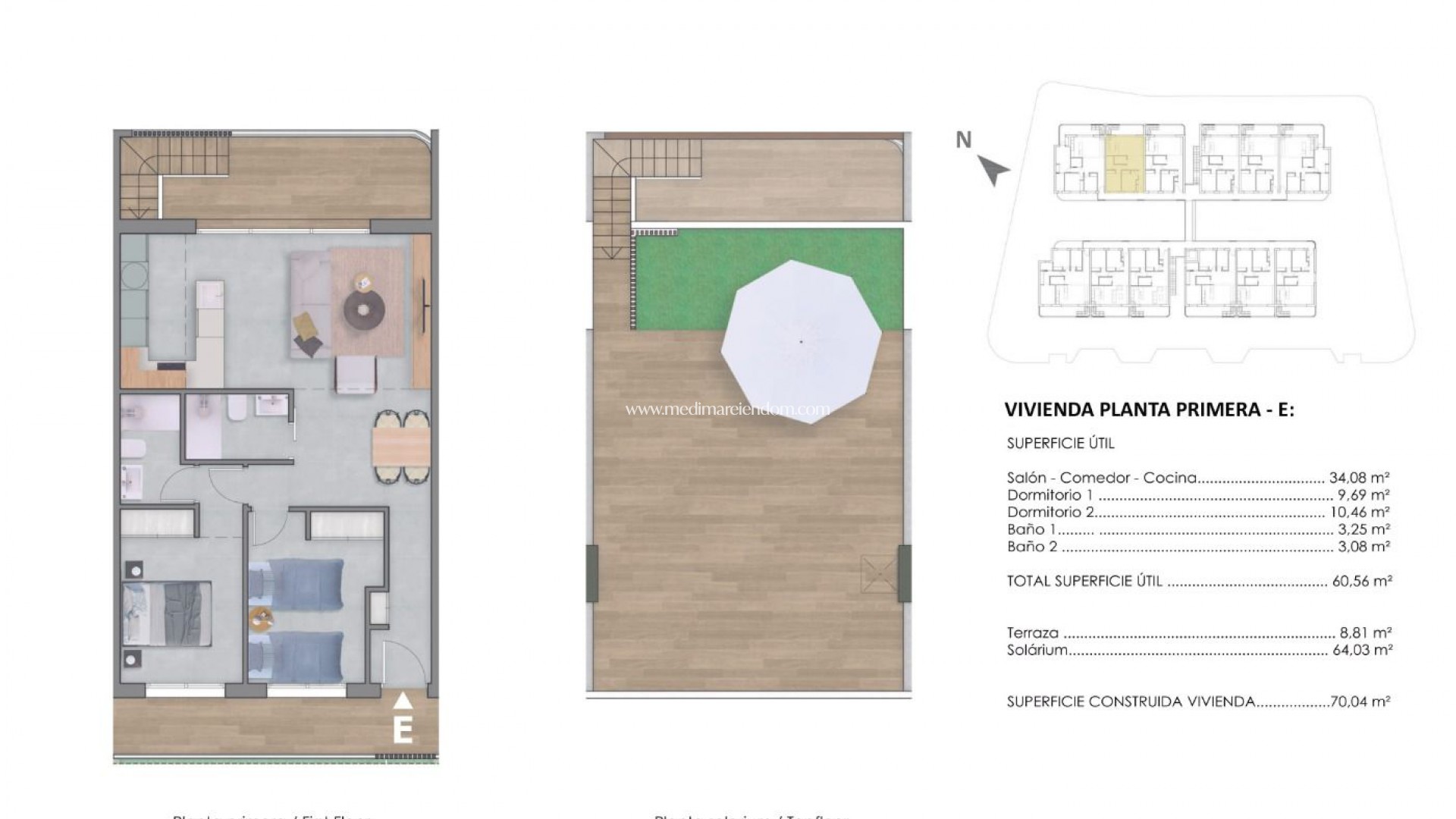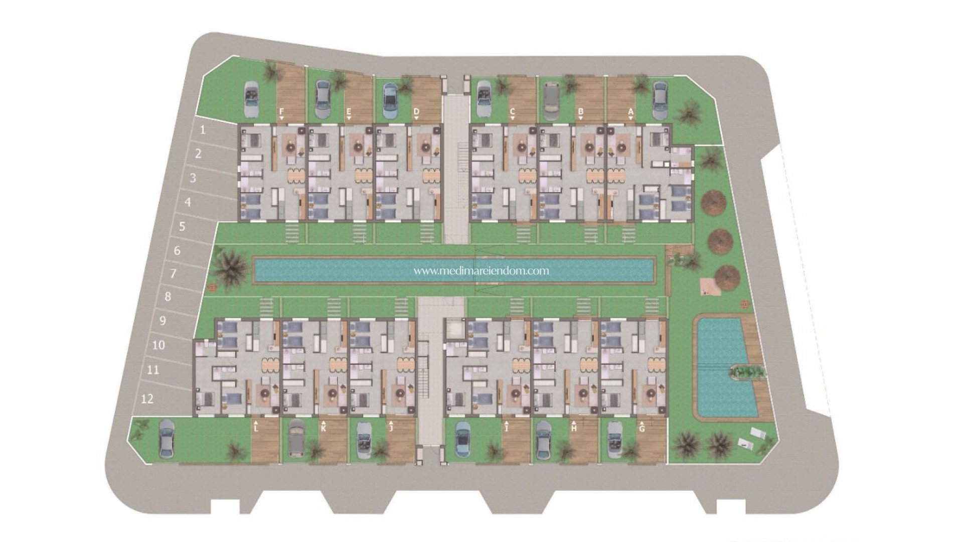NYBYGGT BOSTADSOMRÅDE I PILAR DE LA HORADADA Nybyggt vackert bostadsområde med 24 bungalows, designade och utformade för att leva med maximal komfort i ett privilegierat läge omgivet av alla typer av tjänster och bara 4 km från havet. Dessa fastigheter består av 2 eller 3 sovrum, 2 badrum, öppen planlösning mellan kök och vardagsrum, inbyggda garderober. Bungalows på bottenvåningen med privat trädgård och bungalows på översta våningen med privat solarium. Alla fastigheter har parkeringsplats. Bostadsområdet har ett utmärkt gemensamt område med en pool och en utomhuspool. Pilar de la Horadada är en typisk spansk by i den sydligaste delen av Costa Blanca. På den stora huvudgatan finns stormarknader, massor av affärer, restauranger och barer och några vackra torg. De vackra stränderna Torre de la Horadada och Mil Palmeras med fin sandpromenad ligger bara 5 minuter bort. I Pilar de la Horadada finns också ett välutvecklat cykel- och promenadvägnät och det finns också ett stort utbud av olika sportaktiviteter. Lo Romero 18-håls golfbana ligger bara en kort bilresa från staden. Flygplatserna Corvera (Murcia) och Alicante ligger 40 respektive 55 minuter bort.