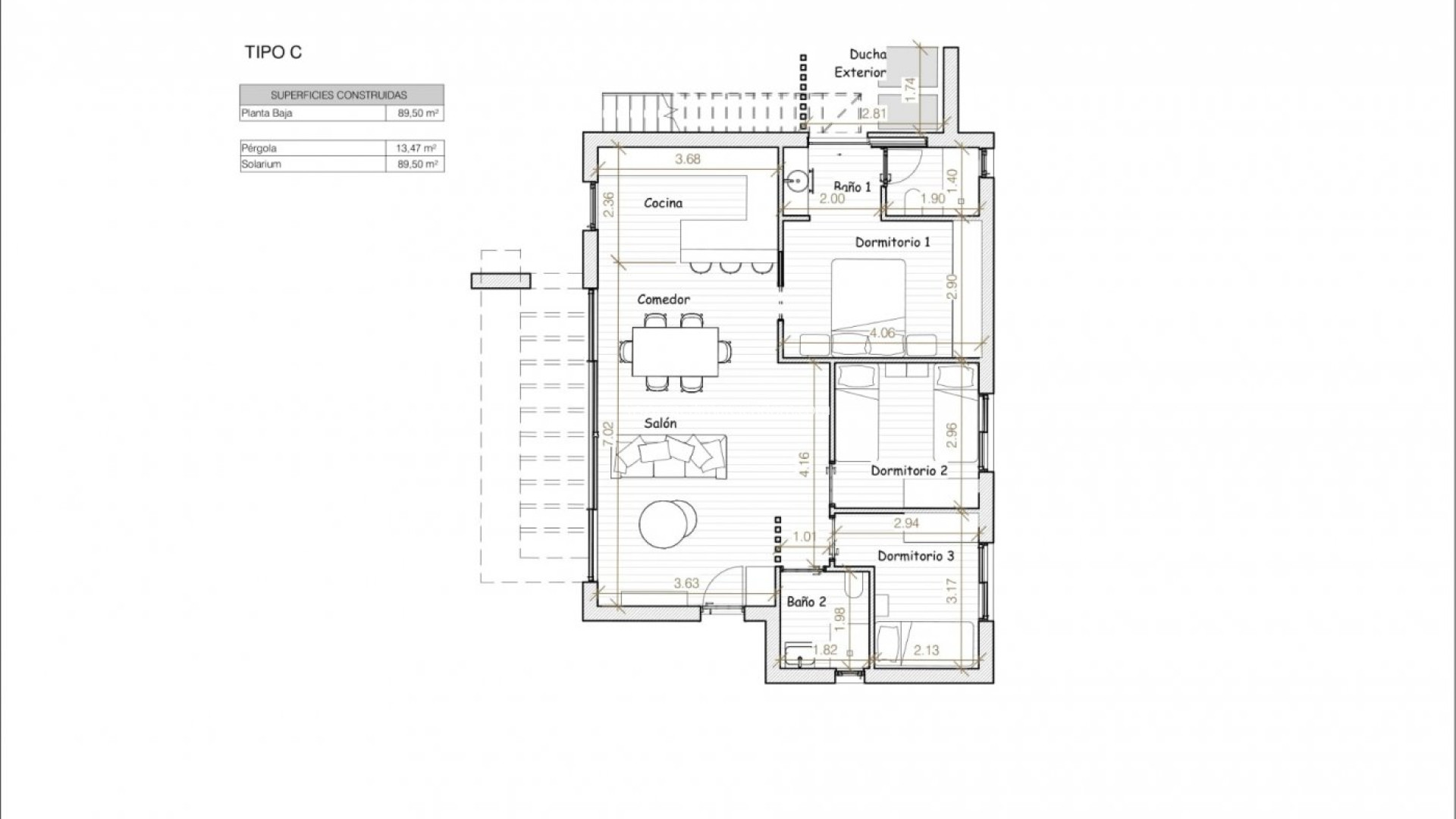 NYBYGGDA VILLOR Nybyggnation av 5 fristående villor (3 olika typer A, B och C) i San Miguel de Salinas. Moderna designvillor som skapats för att njuta av den spanska solen. Villorna har 3 sovrum, 2 badrum, öppet kök med rymligt vardagsrum, inbyggda garderober, terrass. Varje villa har en egen tomt, parkeringsplats och pool. Ett alternativ för ett solarium mot en extra kostnad. San Miguel de Salinas ligger nära golfbanorna Las Colinas och Campoamor, erbjuder exceptionell utsikt över lagunerna Torrevieja och La Mata. San Miguel de Salinas är en kommun i Valencianska gemenskapen, Spanien. Den ligger i södra delen av Alicanteprovinsen, i regionen Vega Baja del Segura nära regionen Murcia. Alicantes flygplats ligger 35 minuters bilresa bort och Murcias Corveras flygplats ligger ca 1 timmes bilresa bort.
