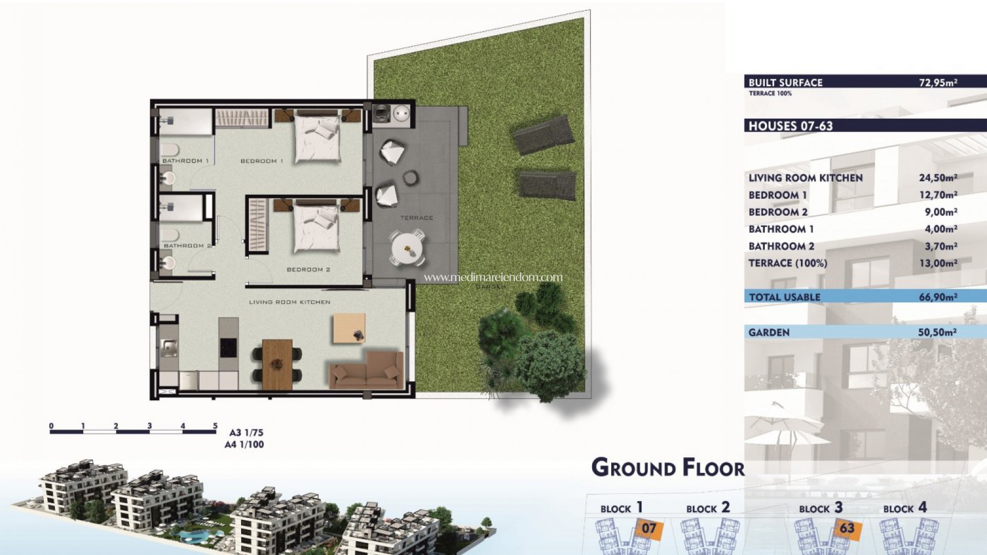 NYBYGGT BOSTADSOMRÅDE I VILLAMARTIN Nybyggd bostadsområde med 112 mycket mysiga fastigheter med 2 sovrum och 2 badrum, på cirka 72m2 byggd, med modern fördelning och med stora terrasser. Alla fastigheter är mycket väl orienterade och får ljus och värme från solen hela året. Bostäderna består av bottenvåningarna med privat trädgård, lägenheter med terrasser och exklusiva takvåningar på översta våningen med privat solarium. Gemensamma utrymmen har en stor pool och en jacuzzi, stora trädgårdsområden med en lekplats och ett träningsområde. Bostadsområde beläget nära de två mest kända golfklubbarna i området och mycket nära till all service. De gyllene Orihuela Costa-stränderna ligger bara 5 minuters bilresa bort liksom det nya köpcentret Zenia Boulevard (största köpcentret i Alicanteprovinsen med Europas största klädbutik Primark). Det finns 3 andra golfbanor som alla ligger inom 5 minuters bilresa. Det finns tennisbanor och tennisundervisning på det närliggande Campoamor-hotellet. Flygplatserna Alicante och Murcia ligger 45 minuters bilresa bort.