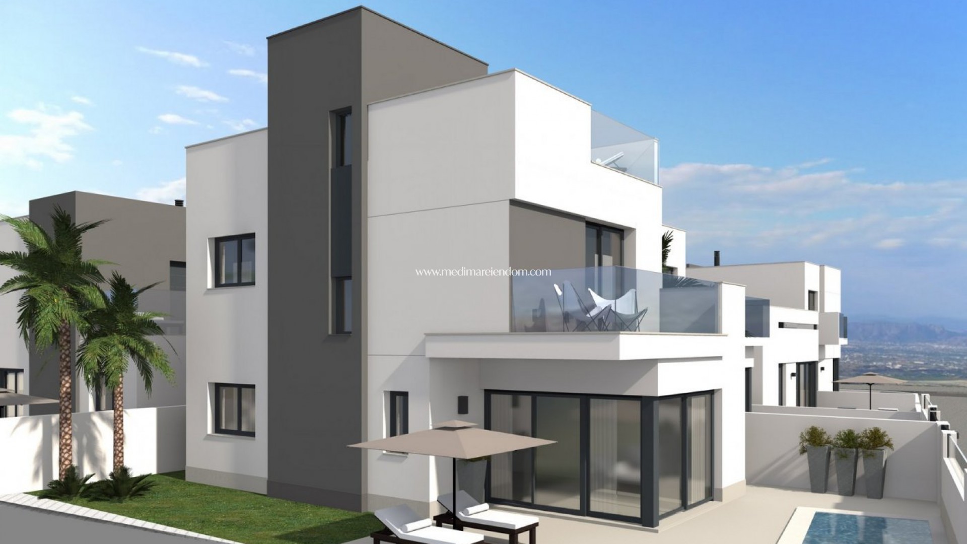 NYBYGGDA VILLOR I PINAR DE CAMPOVERDE Vacker nybyggd villa med frivillig privat pool i Pinar de Campoverde. Villa byggd på 2 våningar med 3 sovrum, 3 badrum, öppet kök med vardagsrum och terrass. Villan har trädgård med frivillig privat pool och parkeringsplats på tomten. Privat solarium på 32m2 är ett alternativ mot en extra kostnad. Golfbanan Lo Romero ligger i närheten och sandstränderna i Torre de la Horadada ligger 15 minuters bilresa bort. Pinar de Campoverde är en by som ligger på en skogsklädd sluttning, 8 km inåt landet med utsikt över Medelhavet. Här bor många nordeuropeiska invånare. I Campoverdes centrum finns flera barer, restauranger, en stormarknad och en bank. Det finns en liten gatumarknad på söndagsmorgnarna. Sydväst om byn ligger den berömda naturparken Rio Seca där man kan vandra längs flodens (oftast torra!) bädd. Det finns en spektakulär ravin som vattnet under årtusenden har skurit ut genom den gula sandstenen. Flygplatserna Corvera (Murcia) och Alicante ligger 40 respektive 55 minuter bort.