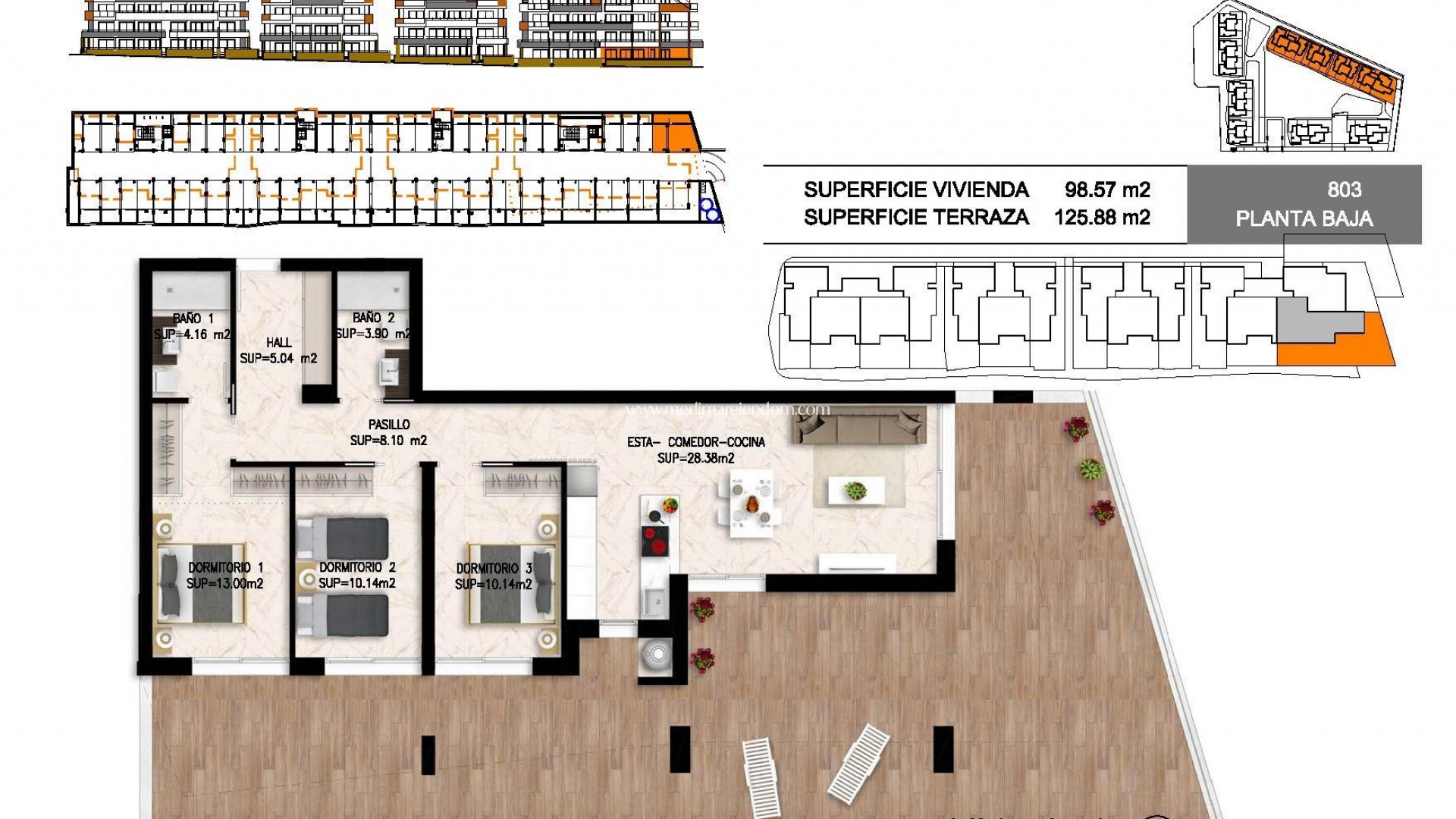 NYBYGGT BOSTADSOMRÅDE I PLAYA FLAMENCA Nybyggt lyxigt komplex av lägenheter med 2/3 sovrum, 2 badrum och stora terrasser i Playa Flamenca nära havet. De flesta lägenheterna har havsutsikt! Du kan välja mellan lägenheter på bottenvåningen med trädgård, lägenheter på första och andra våningen med terrass eller takvåningar (med solarium) på tredje våningen. Alla lägenheter kommer med underjordisk parkering och stängt förråd. Komplexet erbjuder dig också en gemensam pool med grönområden, ett gym med bastu, en lekplats för barn och ett pentaquinområde. Playa Flamenca är ett lugnt bostadsområde vid stranden, som ligger 40 minuters bilresa från Alicantes flygplats och 15 minuters bilresa från den livliga staden Torrevieja. Urbanisationen som består av lägenheter och villor ligger vid en välskött, liten strand med möjlighet att hyra solsängar under sommarmånaderna. På andra sidan huvudvägen, inåt landet från anläggningen, finns ett stort modernt köpcentrum med en stor snabbköpsaffär, många restauranger och barer, banker, frisörer och boutiquer. Tre mästerskapsbanor ligger inom 10 minuters bilresa från orten, däribland den fantastiska Villamartin, som ofta är en av spelplatserna för Mediterranean Open. Campoamor Golf Course ligger bland palmer och pinjeträd och är en skönhet; närliggande Las Ramblas är en annan magnifik bana och ett riktigt test av golfkunskaper.