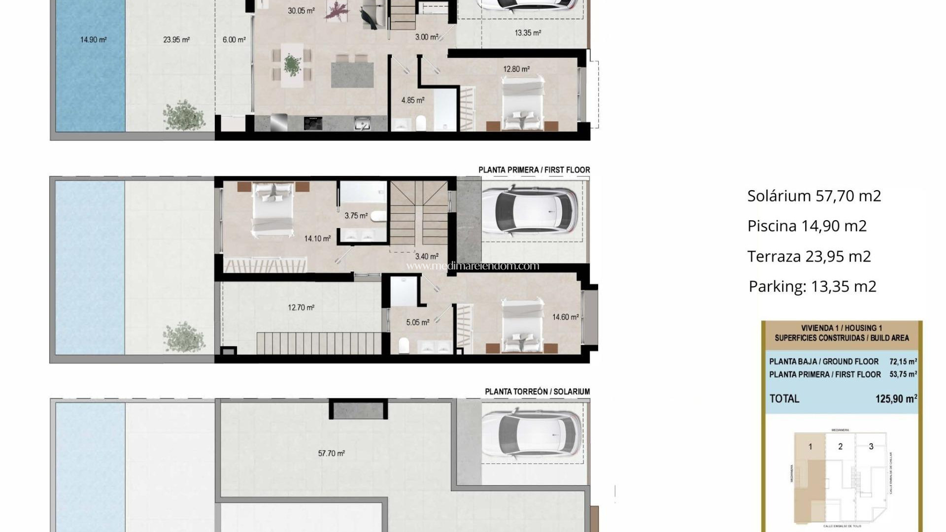 Nybyggda radhus i San Javier - modern design och privilegierat läge Radhus med modern design och privat pool Upptäck detta exklusiva komplex med tre helt nya radhus i San Javier, Murcia, utformade för att erbjuda maximal komfort och en modern livsstil. Varje fastighet har en privat pool, terrass, solarium och parkeringsplats, vilket ger ett idealiskt utrymme för avkoppling och njutning året runt. Bostäderna har byggts med högkvalitativa material och en öppen planlösning som gör det mesta av det naturliga ljuset. De är perfekta för både permanentboende och semesterboende på Costa Cálida. Distribution och utrustning av hög kvalitet Varje radhus har: 3 rymliga sovrum med inbyggda garderober och byråer. 3 fullt utrustade badrum med möbler, speglar och skärmar. Öppet konceptkök, fullt utrustat och med vitvaror ingår. Rymligt vardagsrum med matsal, med stora fönster som ansluter till terrassen. Privat pool med dusch och trädgård med konstgräs. Solarium med sommarkök, perfekt för att njuta av Medelhavsklimatet. Förinstallation av kanaliserad luftkonditionering på varje våning. PVC exteriör snickeri med dubbla glasrutor, vilket garanterar termisk och akustisk isolering. Säkerhetsdörr, för större sinnesfrid och skydd. Strategiskt läge i San Javier San Javier är en kuststad med ett brett utbud av tjänster, sportanläggningar och fritidsområden. Läget för detta bostadsområde ger snabb tillgång till: Stränderna vid Mar Menor - endast 5 minuter med bil. Stränder vid Medelhavet - 10 minuter bort. Golfbanor - Olika alternativ i området, perfekt för golfälskare. Köpcentrum och service - Allt du behöver finns bara några minuter bort. Murcia-Corvera flygplats - 30 minuter bort. Alicantes flygplats - 45 minuter bort. Njut av det bästa klimatet och livskvaliteten i San Javier San Javier är ett utmärkt alternativ för dem som letar efter en fastighet nära havet, med ett privilegierat klimat och tillgång till alla typer av utomhusaktiviteter. Missa inte chansen att köpa ett av dessa exklusiva hem. Kontakta oss idag för mer information eller för att planera ett besök.