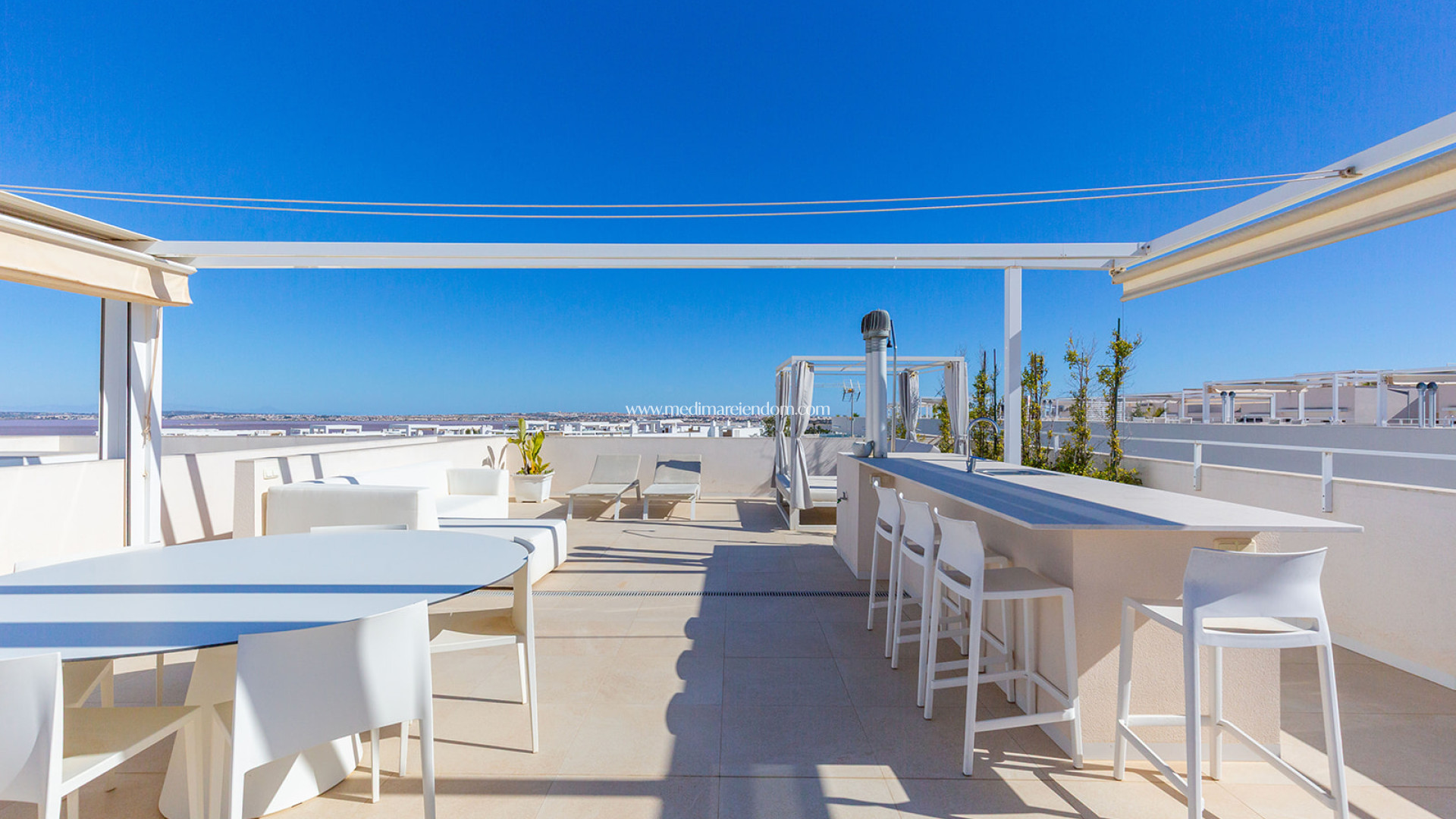Denna exklusiva takvåning i Mirasal, belägen i det prestigefyllda Los Balcones-området i Torrevieja, utmärker sig för sin moderna design, exceptionella ljusstyrka och privilegierade läge på bostadskomplexets högsta punkt. Tack vare detta upphöjda läge har fastigheten panoramautsikt över Torrevieja, Medelhavet och den ikoniska Rosa Saltsjön, ett av de mest unika naturlandskapen på Costa Blanca. Inuti erbjuder takvåningen en rymlig och elegant atmosfär, med ett modernt öppet kök och ett ljust vardagsrum anslutet till en generös terrass med utsikt över infinitypoolen och de anlagda trädgårdarna. Stora fönster från golv till tak skapar en sömlös övergång mellan inomhus- och utomhusutrymmen, vilket förstärker känslan av öppenhet och välbefinnande. Fastighetens höjdpunkt är dess spektakulära privata takterrass, helt utformad för utomhusliv året runt. Utrymmet inkluderar chill-out-områden, en utomhusmatplats, ett barområde och pergolor, vilket gör den perfekt för avkoppling eller underhållning av gäster. Härifrån är den öppna utsikten över saltsjön och hela staden Torrevieja helt enkelt extraordinär. Mirasal är känt för sin moderna arkitektur, stora grönområden och imponerande infinitypool. Dess läge i Los Balcones erbjuder lugn och ro, närhet till alla tjänster, snabb tillgång till sportanläggningar, stormarknader och naturliga omgivningar, och ligger bara en kort bilresa från Torreviejas bästa stränder. En unik möjlighet för dig som söker en modern och exklusiv takvåning med privilegierad utsikt i ett av de finaste bostadskomplexen på Costa Blanca.